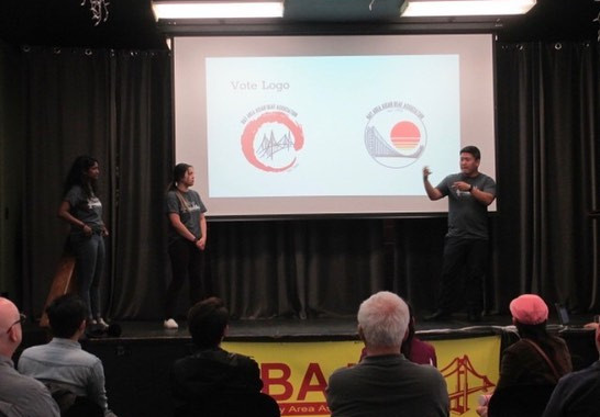 1- A group pix of all attendees sitting and standing on a stage and floor with BAADA banner in yellow and red. 2- Attendees sit and look up at President Byung, VP/PR Janele, and Sec Renu standing on a stage with a projector showing 2 logos up for vote. 3- 5 panelists sit on the stage sharing their asian deaf intersectional experiences. 4- Close up of VP/PR Janele signing 5- Close up of President Byung and Sec Renu signing 6, 7, 8- Attendees sitting at square tables chatting and eating.